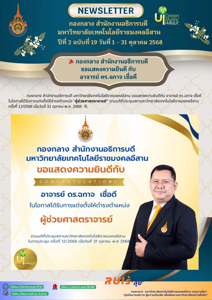 เผยแพร่ จดหมายข่าวประจำเดือนตุลาคม 2568 เพื่อสรุปผลการดำเนินงานและความก้าวหน้าของภารกิจสำคัญ ในรอบเดือนที่ผ่านมา พร้อมสะท้อนบทบาทการขับเคลื่อนงานด้านบริหารจัดการภายในมหาวิทยาลัยฯ ให้มีประสิทธิภาพ บรรลุวัตถุประสงค์ปตามพันธกิจ และยุทธศาสตร์ของมหาวิทยาลัยฯ